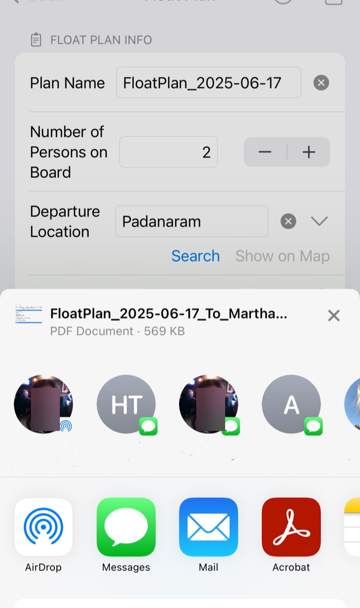 Tap Send to share your Float Plan PDF via email or text with family, friends, or emergency contacts.