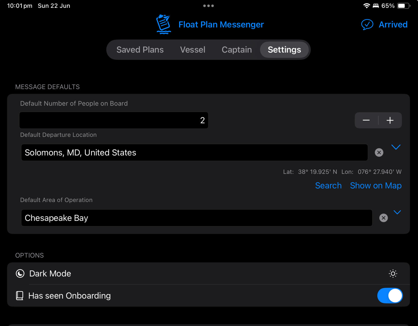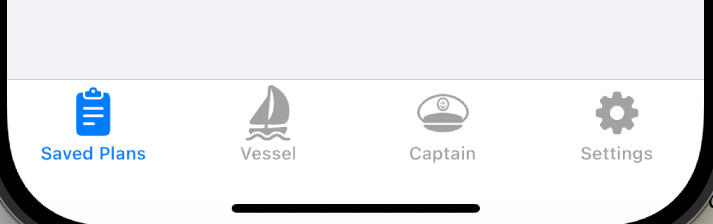 The first lists any saved Plans and lets you create new ones.The second tab stores all your Vessels information.The third tab stores your Captains details.Settings lets you store a default departure location, the default number of people on board and a default body of water.