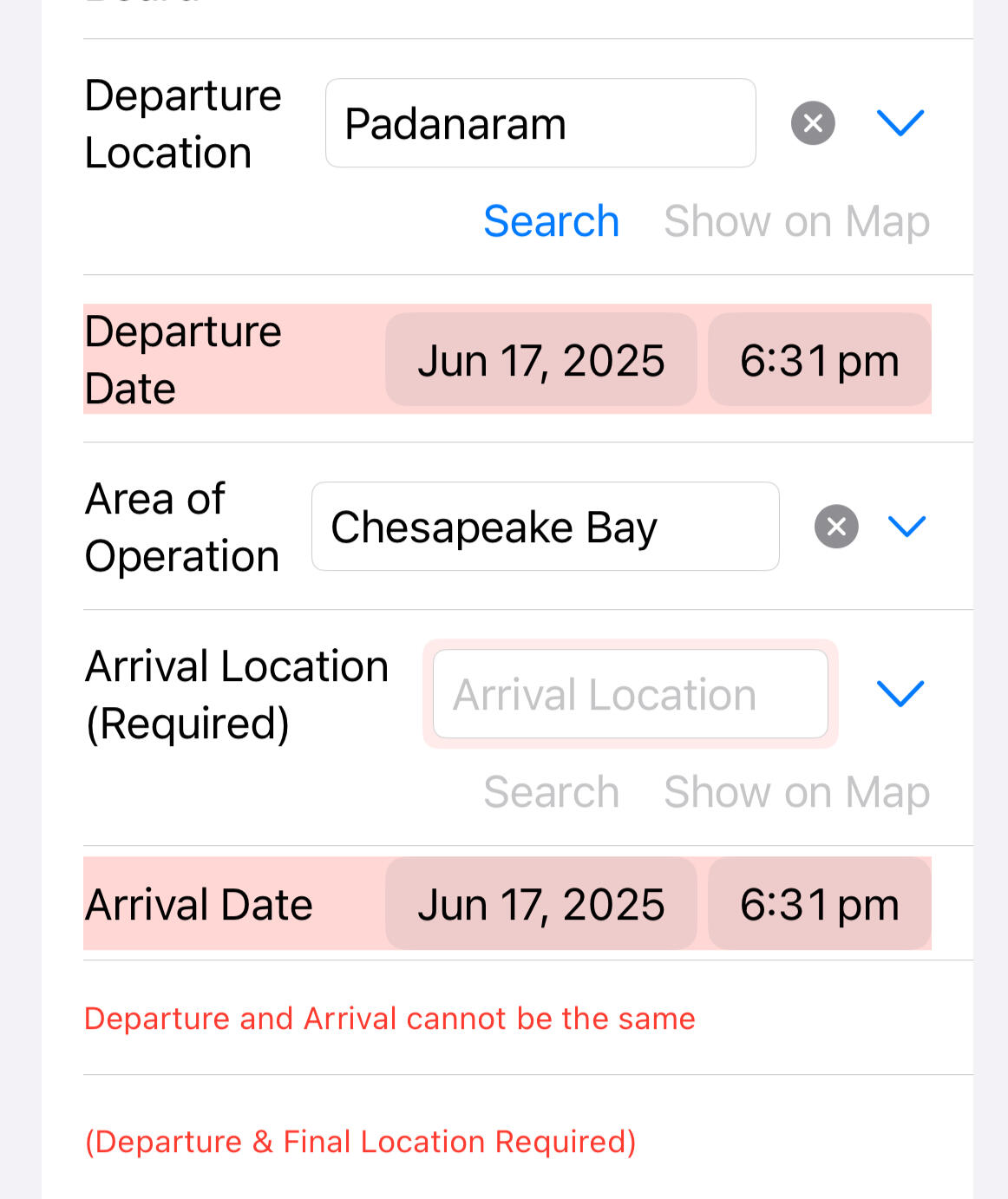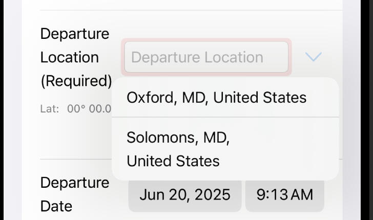 Any previously entered locations can be selected from a drop down menu. The list builds as you add a homeport and departure/arrival locations.