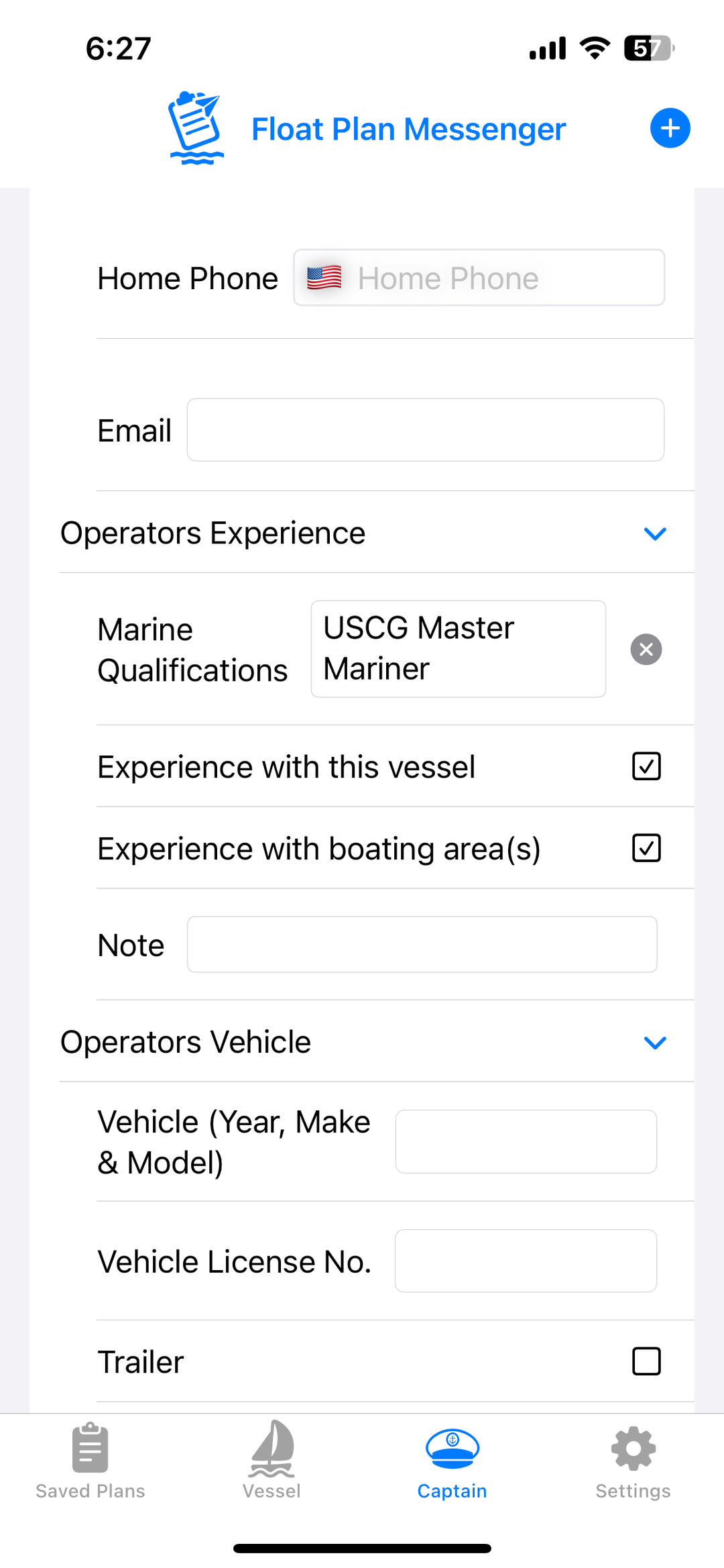 The first lists any saved Plans and lets you create new ones.The second tab stores all your Vessels information.The third tab stores your Captains details.Settings lets you store a default departure location, the default number of people on board and a default body of water.